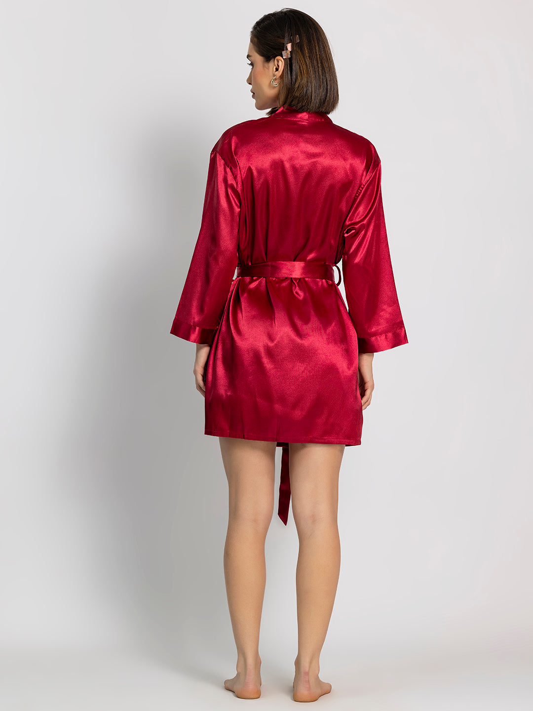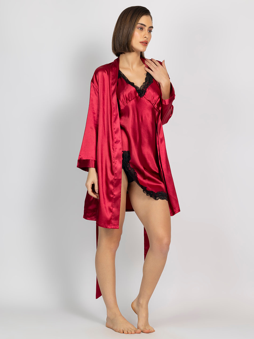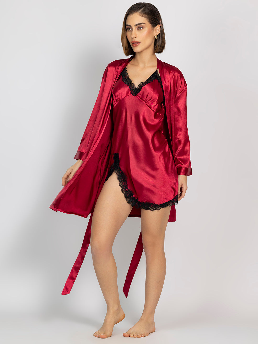 Red Satin Short Dress with Full-Sleeve Robe Set