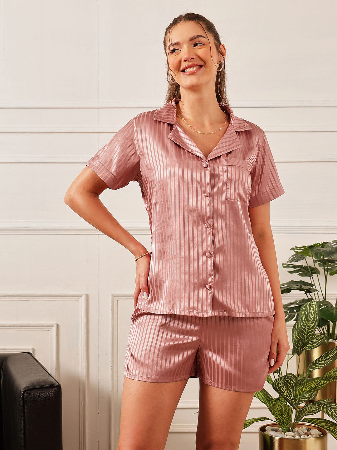 The button-down shirt is crafted from soft self-striped satin, featuring a classic collar, half sleeves, and a functional patch pocket for added charm. Paired with flared satin shorts in a perfectly matching hue, the bottoms offer exceptional comfort and include two practical pockets, making them as functional as they are stylish.Whether for cozy evenings, relaxed mornings, or gifting, this set brings together refined style and irresistible ease.