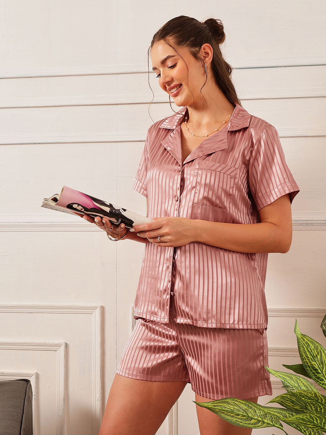 Blush Pink Satin Half Sleeves Shirt And Shorts Set