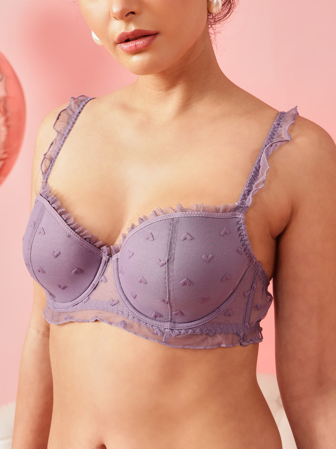 The bra features lightly padded underwired demi-coverage cups that offer gentle shaping and lift while maintaining a natural silhouette. Crafted in soft, cute mesh fabric and Delicate mesh ruffle detailing on the shoulder straps adds a feminine accent. Comes with matching mesh panty completes the set with coordinated styling and all-day comfort.