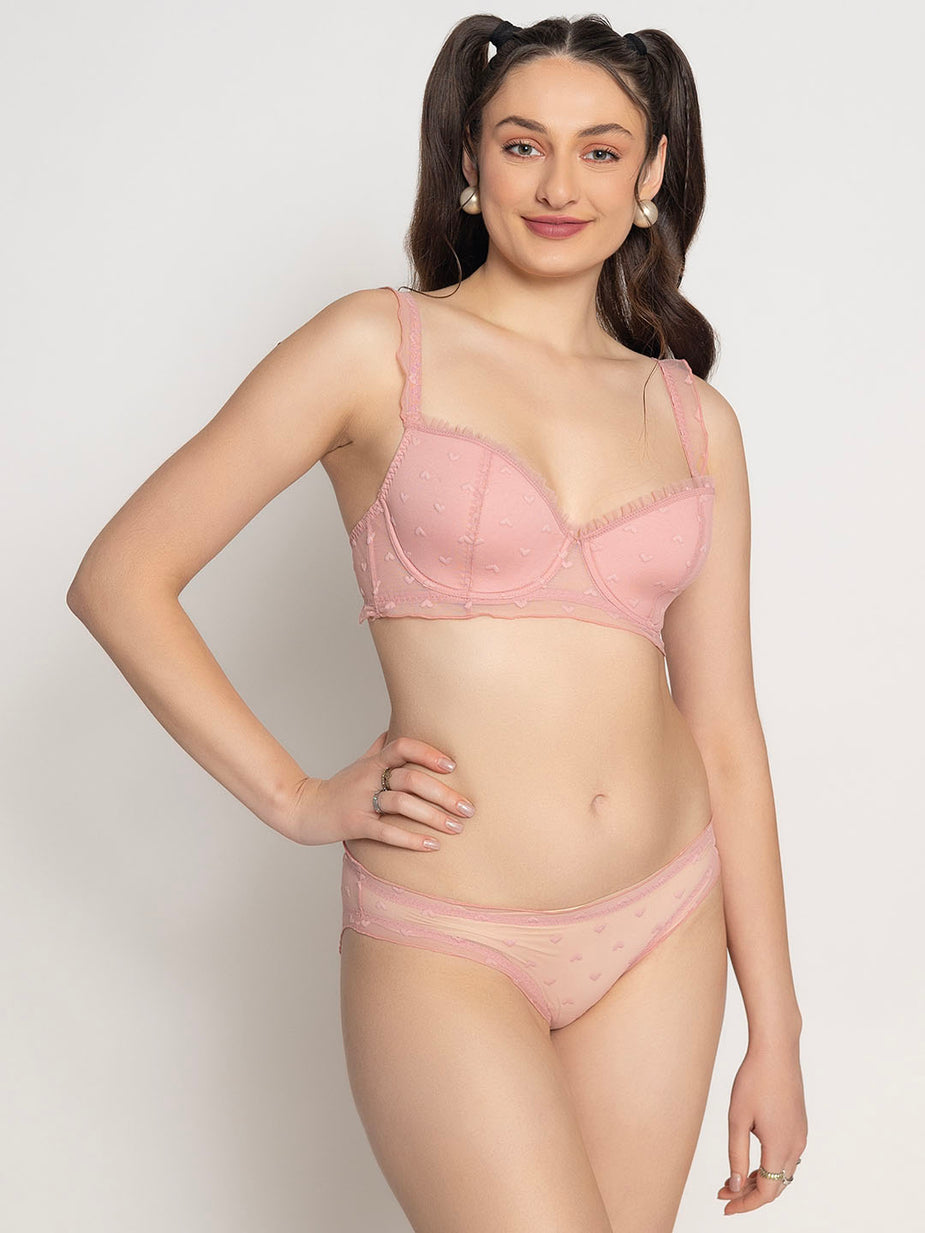 Lightly Padded Underwired Demi Coverage Mesh Bra & Brief Set
