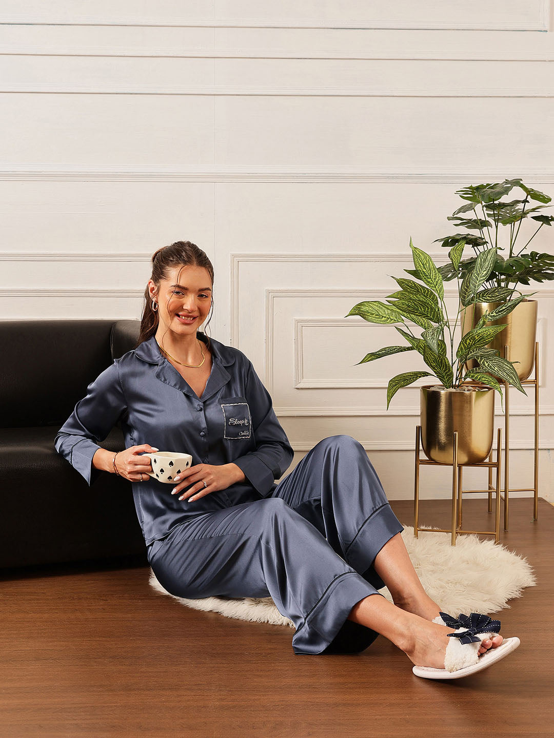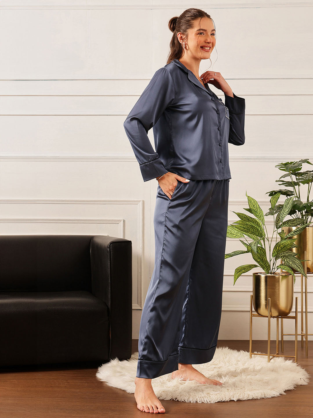 Slaty Blue Satin Full Sleeves Shirt & Pyjama Set