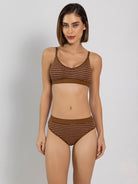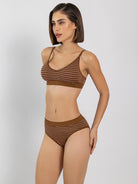 Step into comfort and style with this striped lingerie set. Features a mid-rise bikini with medium coverage and a full-coverage U-back T-shirt bra. Non-wired with padded cups and a cut & sew finish, comfortable fit for everyday wear.