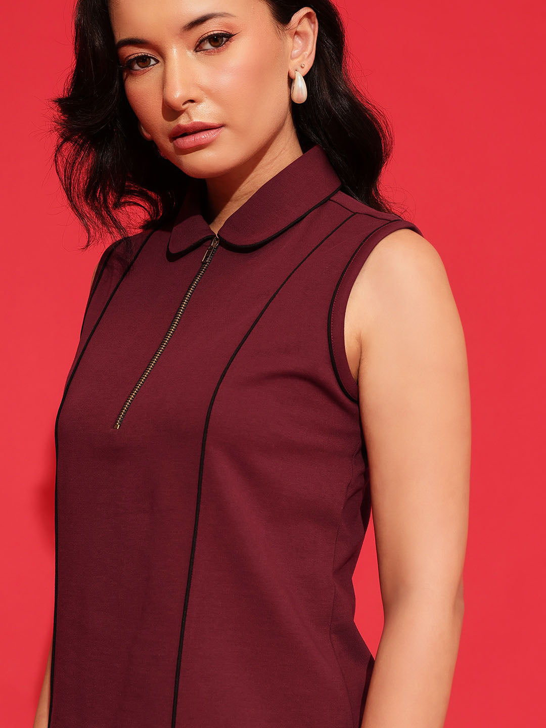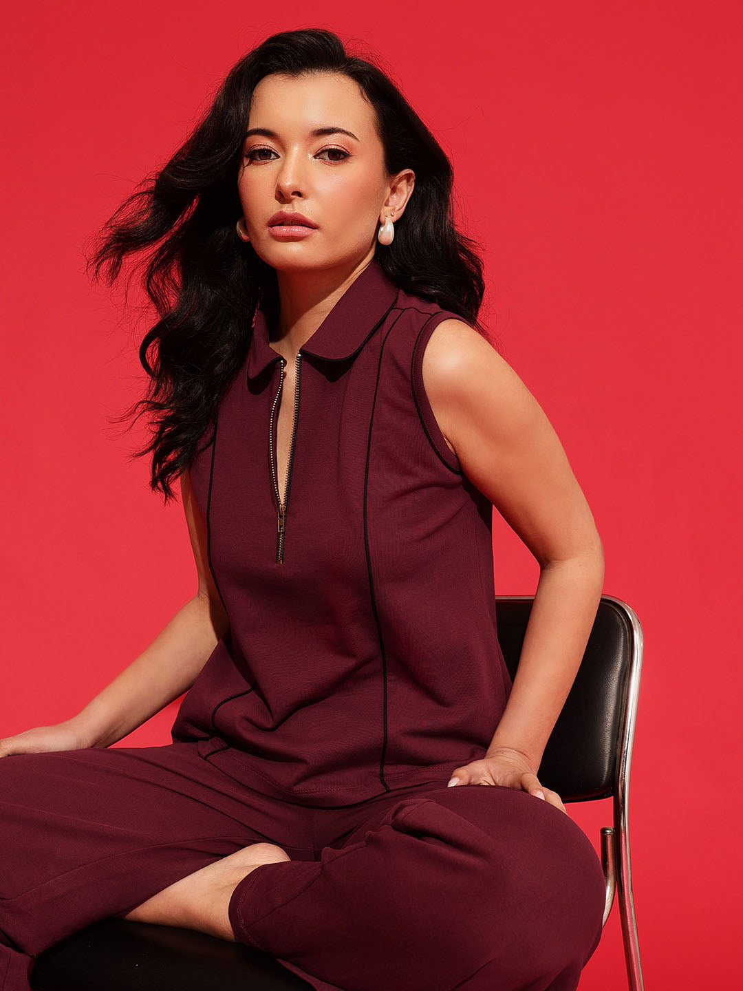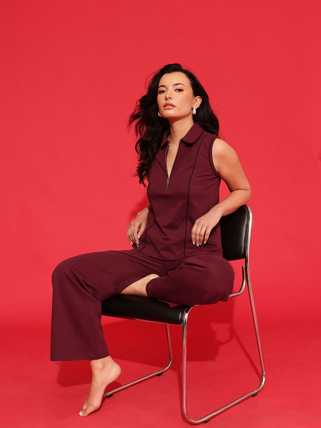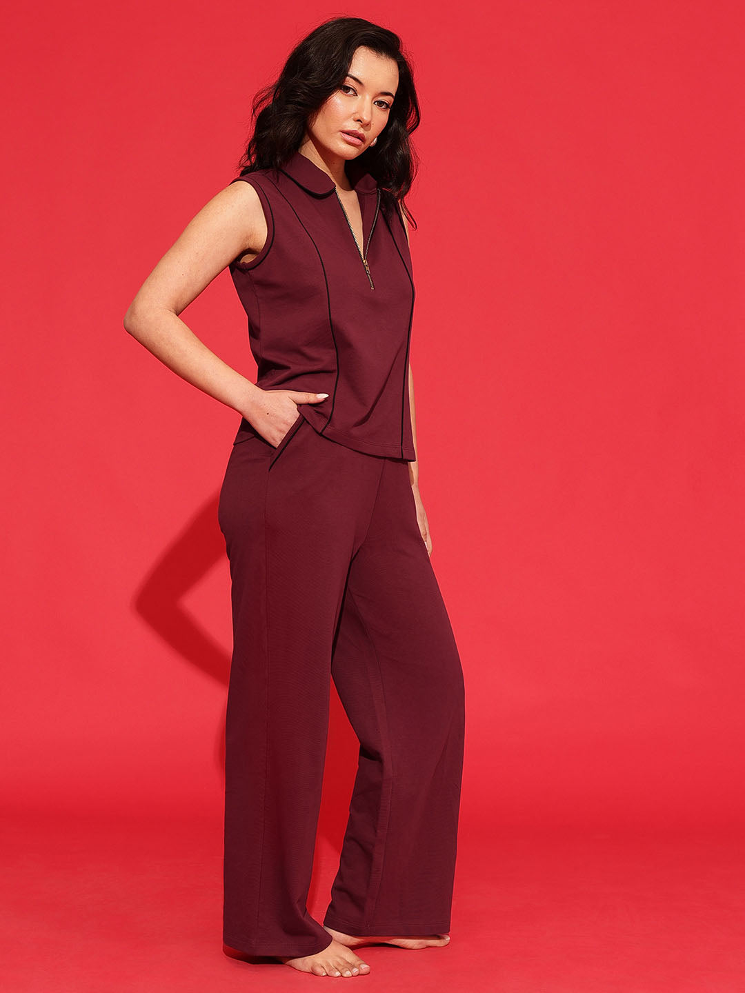 Maroon Sleeveless Collared Top & Pyjama Loungewear Set