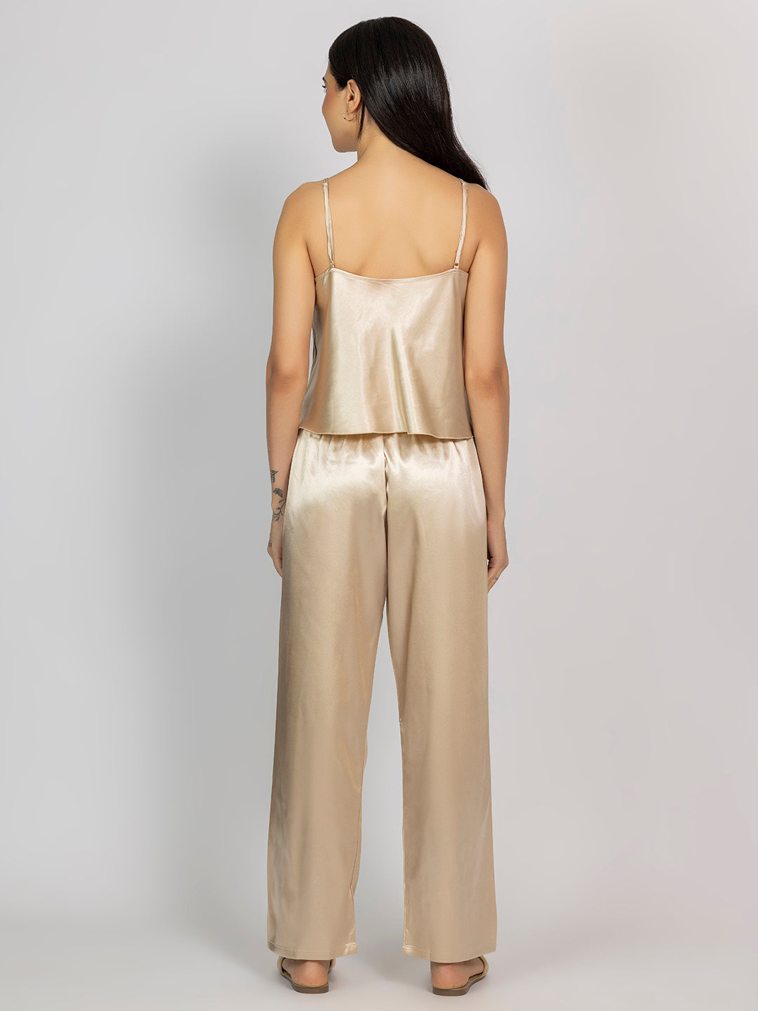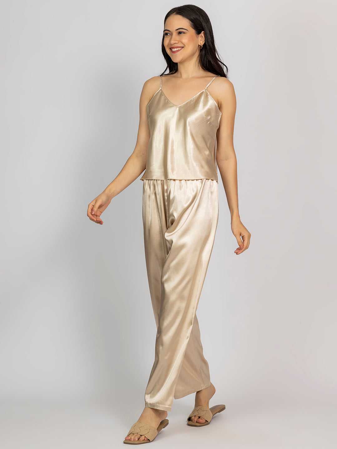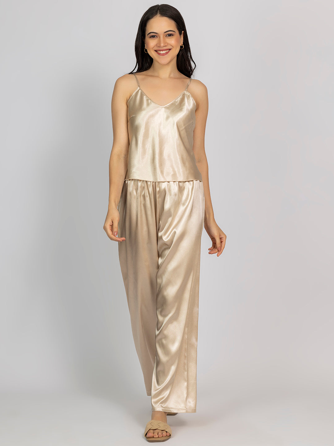 This champagne satin set features a V-neck camisole and full-length relaxed-fit pajama pants. Ideal for luxurious sleepwear or stylish loungewear.