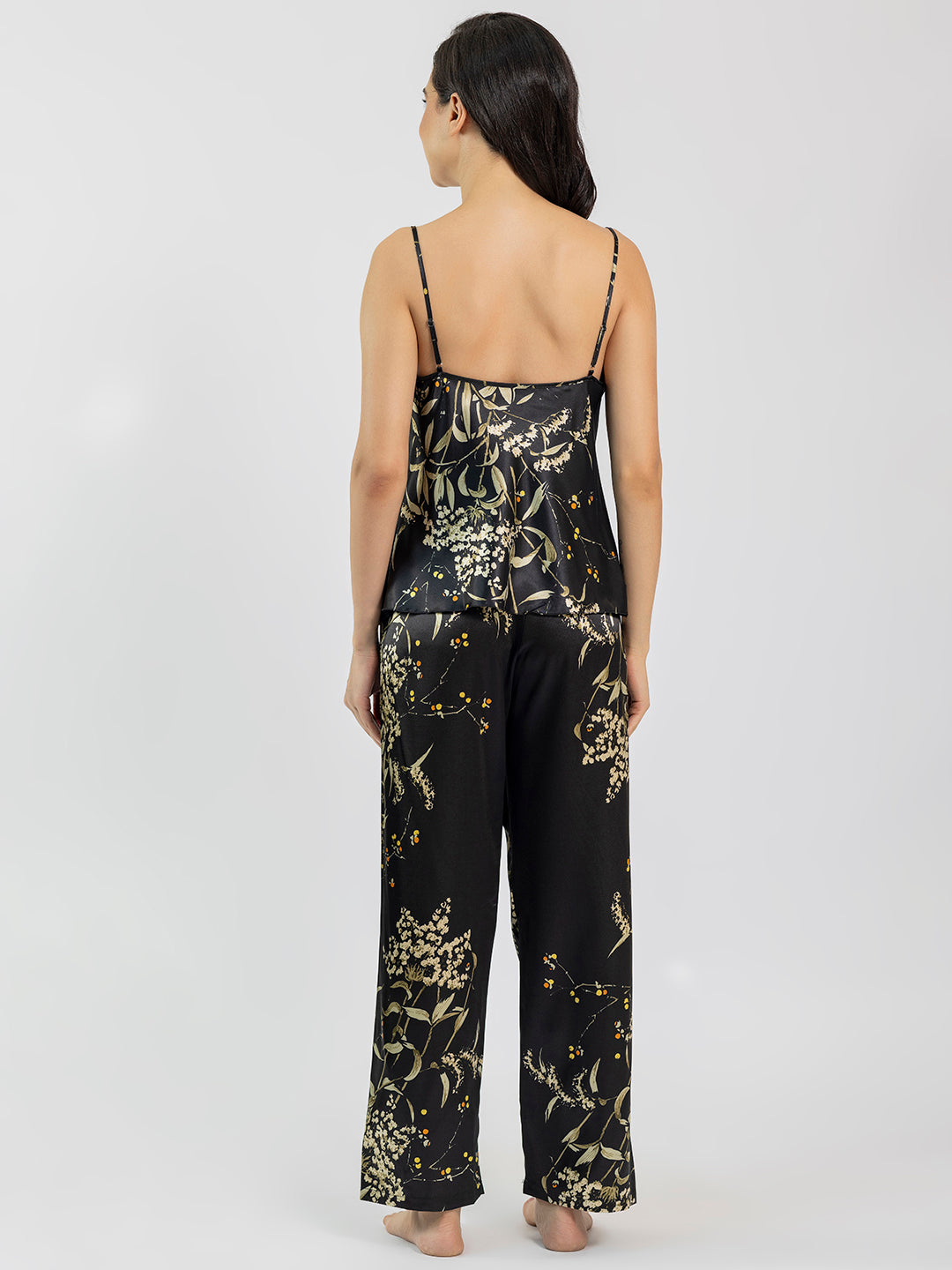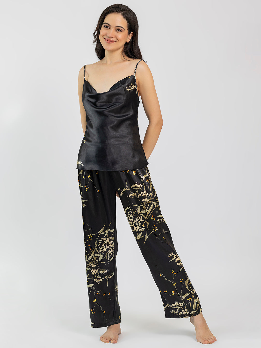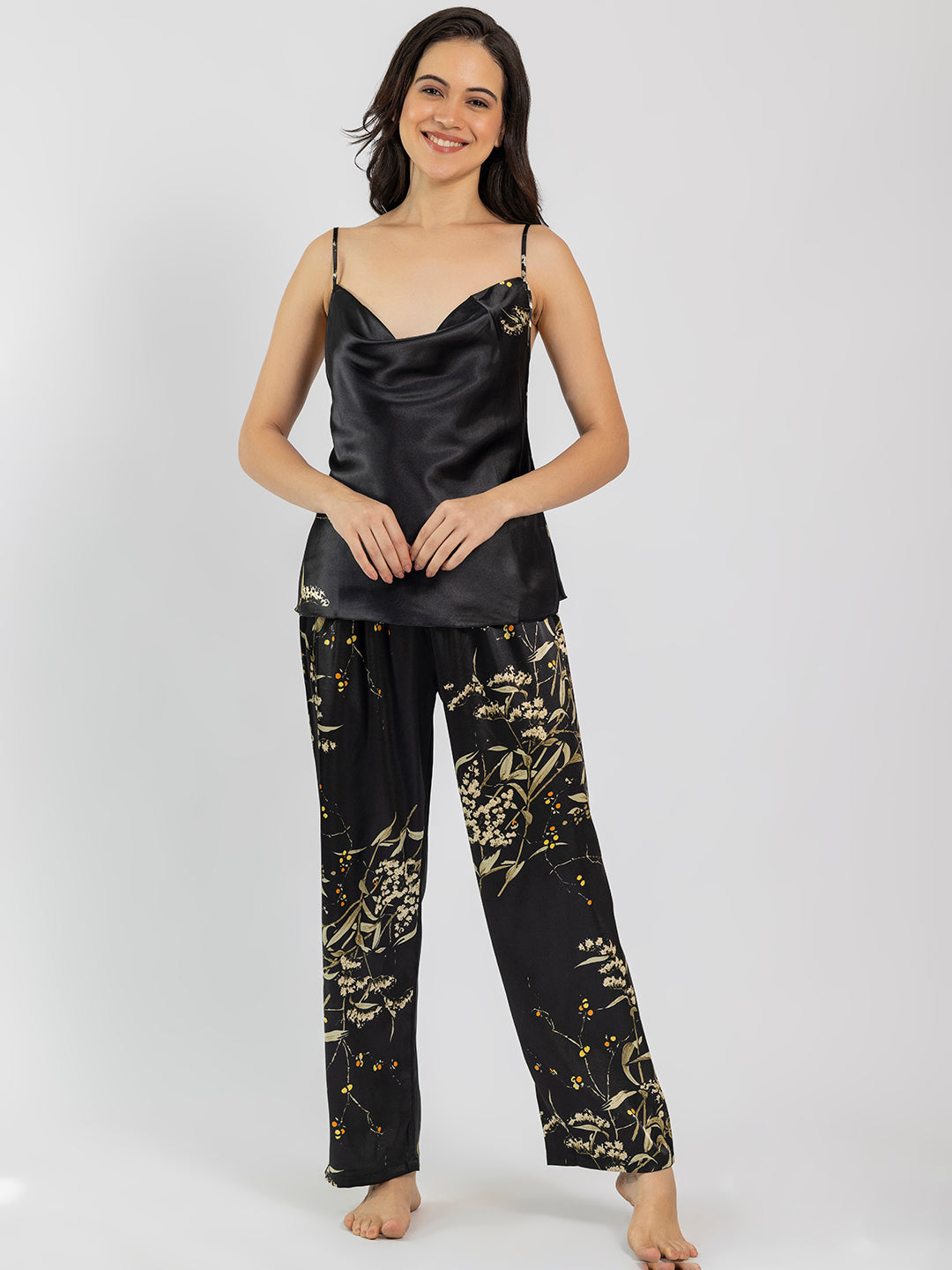 This black satin set features a cowl-neck camisole and full-length relaxed-fit pajama pants with a delicate floral print. Comfortable, stylish, and ideal for sleepwear & loungewear.
