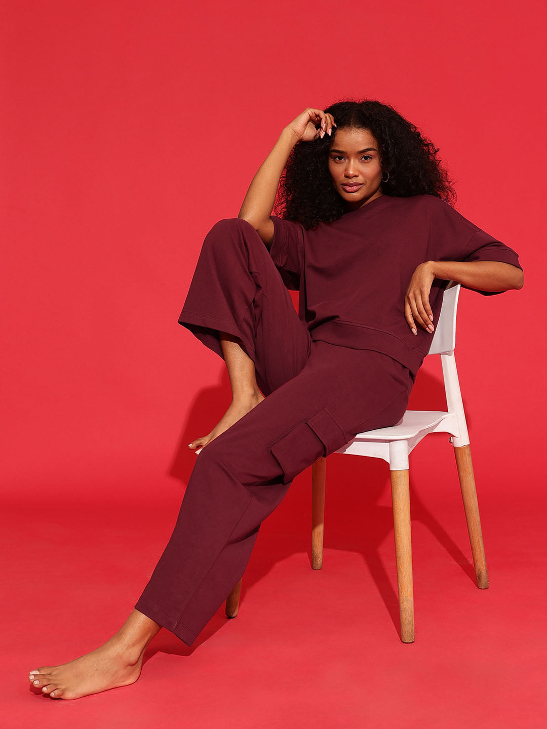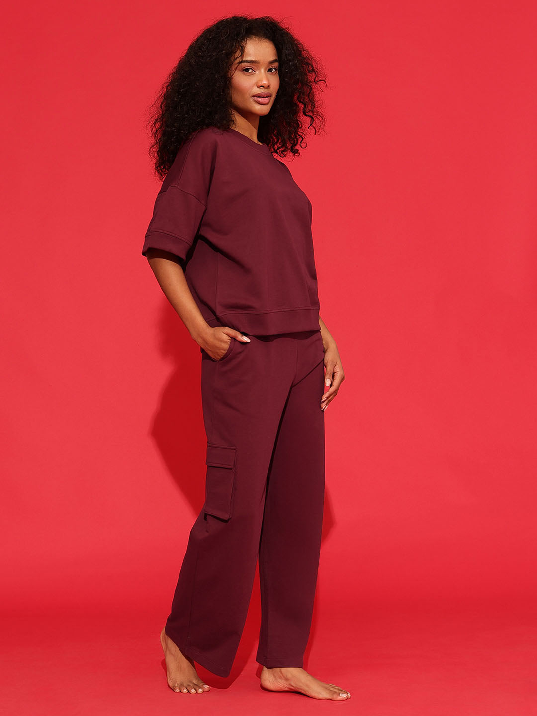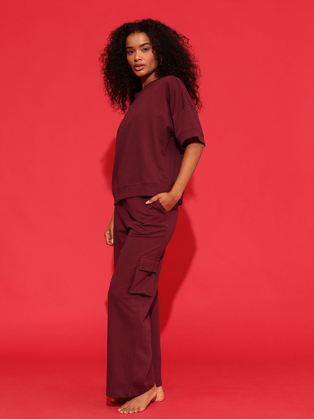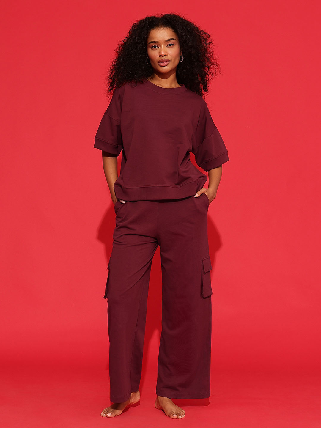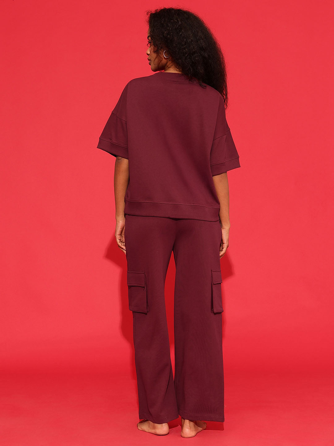 Cotton terry lounge coord set, round neck half sleeves relaxed boxy top, with cargo pants with 4 pockets.