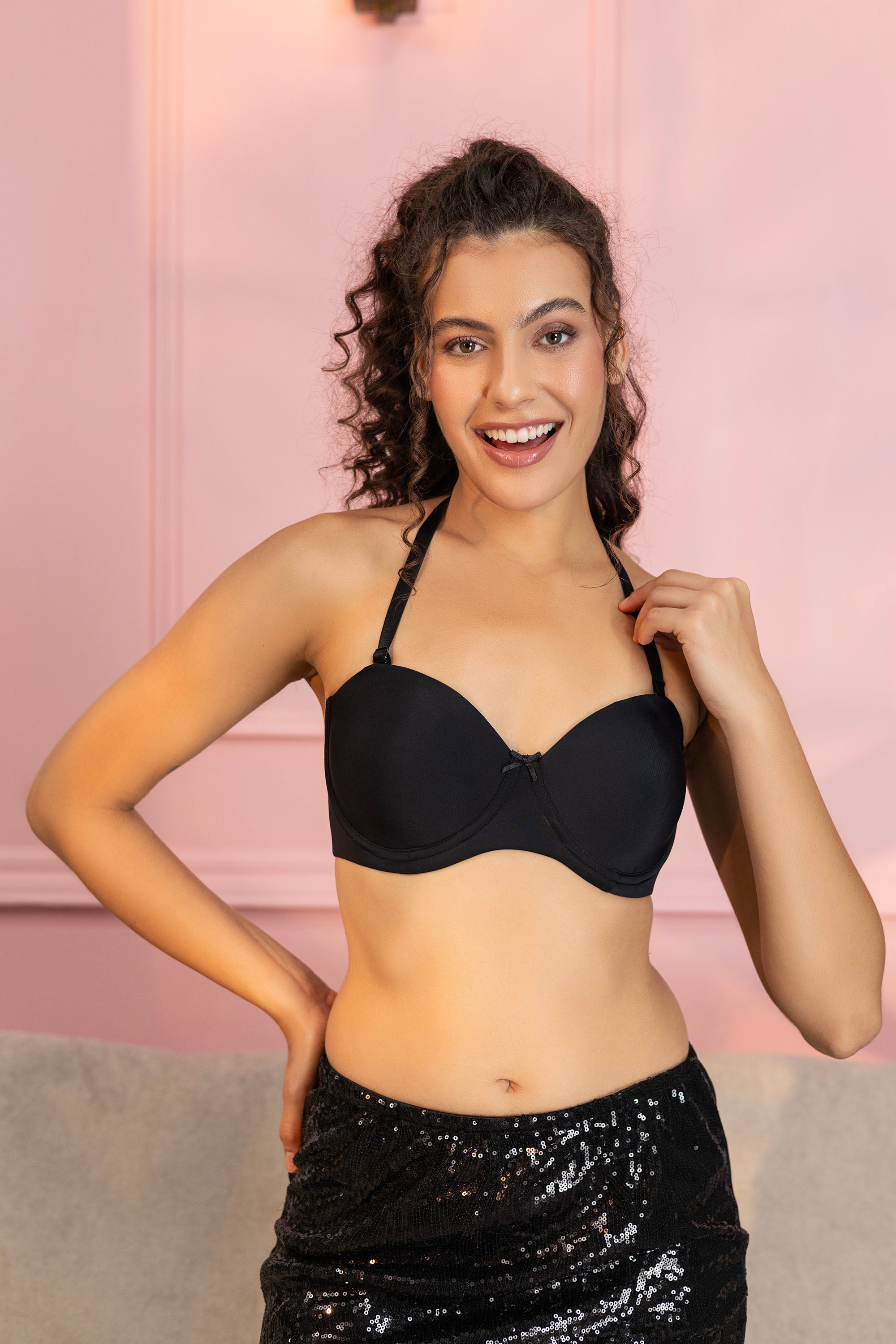 Experience confident support and effortless style with this strapless wired balconette bra, designed to stay perfectly in place. The silicon taping along the inside neckline ensures a secure, slip-free fit, while the satin-finish adjustable multiway straps offer versatile styling options-wear it strapless, halter, cross-back, or one-shoulder. Finished with a two hook-and-eye closure for a comfortable and secure hold, this bra delivers both sophistication and stability for any occasion.