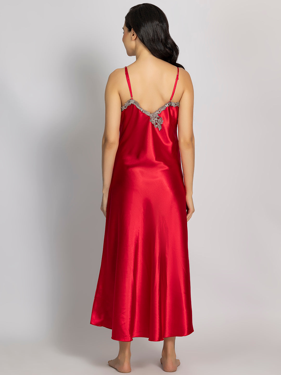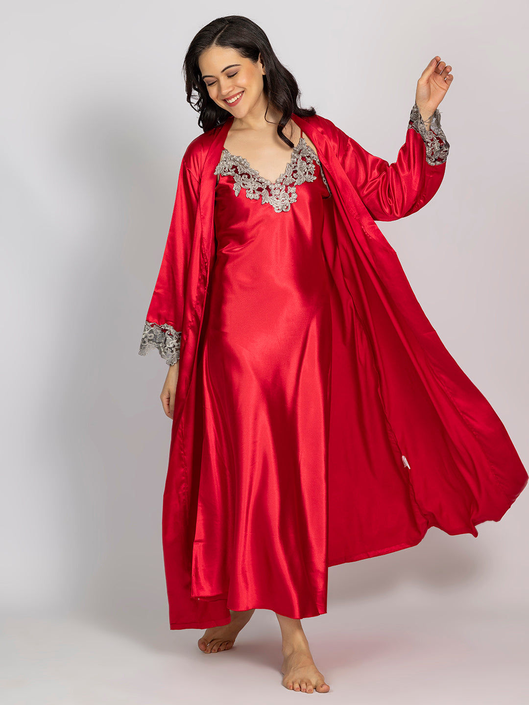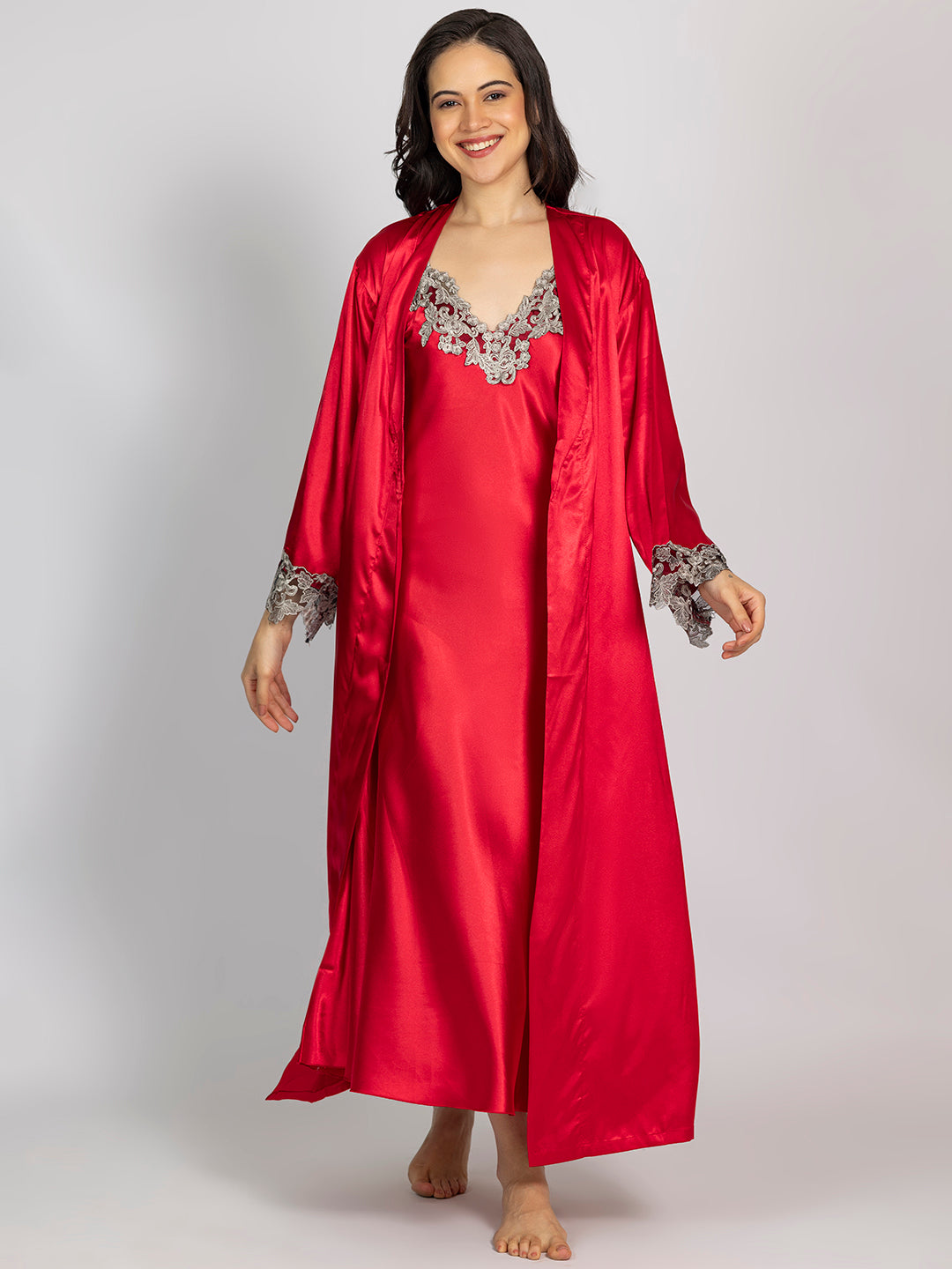 Cherry red maxi nightdress with a V-neckline and embroidered detailing, complemented by a matching full-sleeve robe for a graceful and comfortable nightwear set.