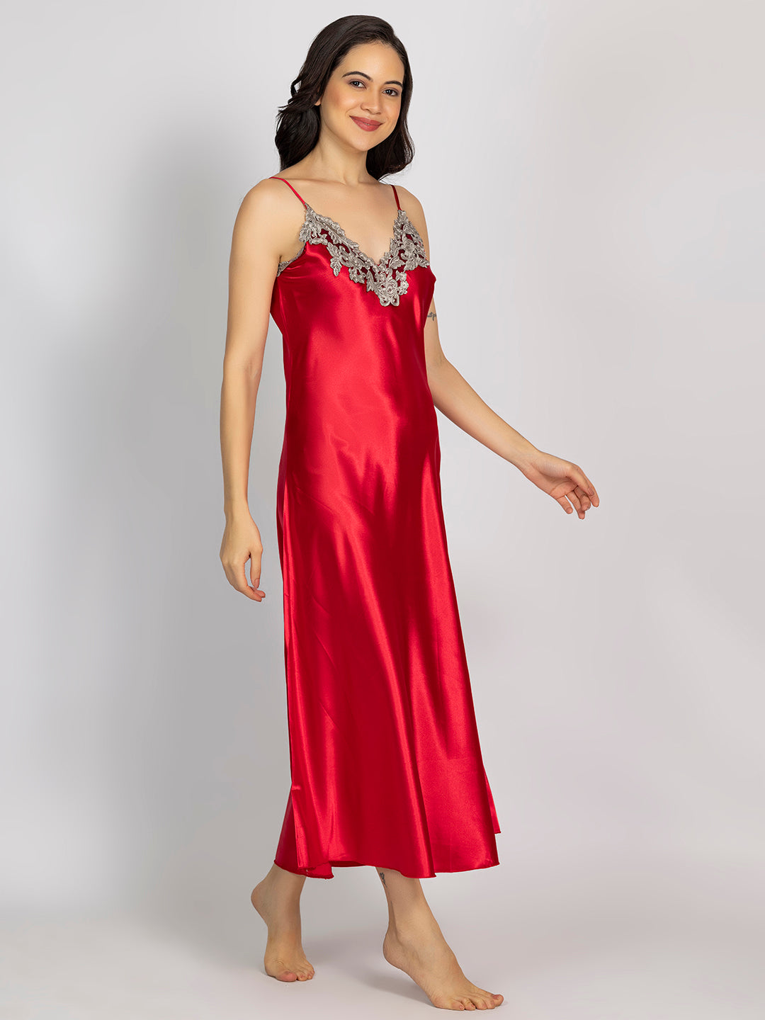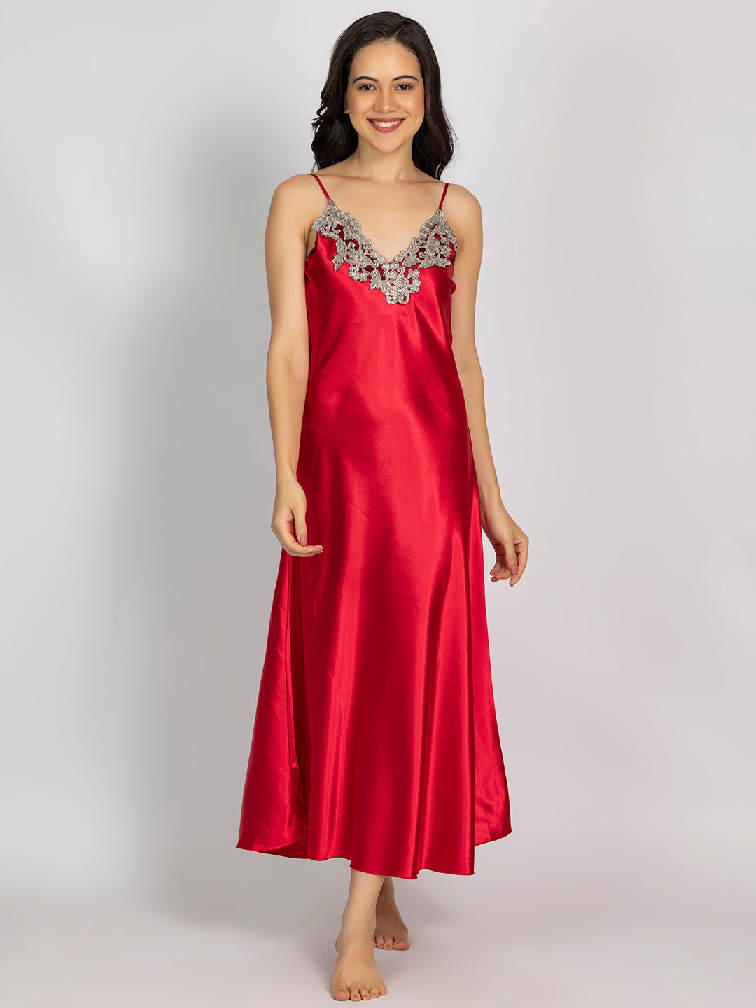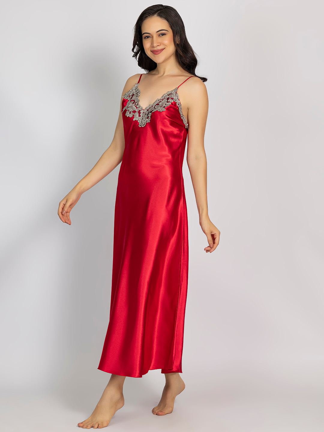 Cherry red maxi nightdress with a V-neckline and embroidered detailing, complemented by a matching full-sleeve robe for a graceful and comfortable nightwear set.