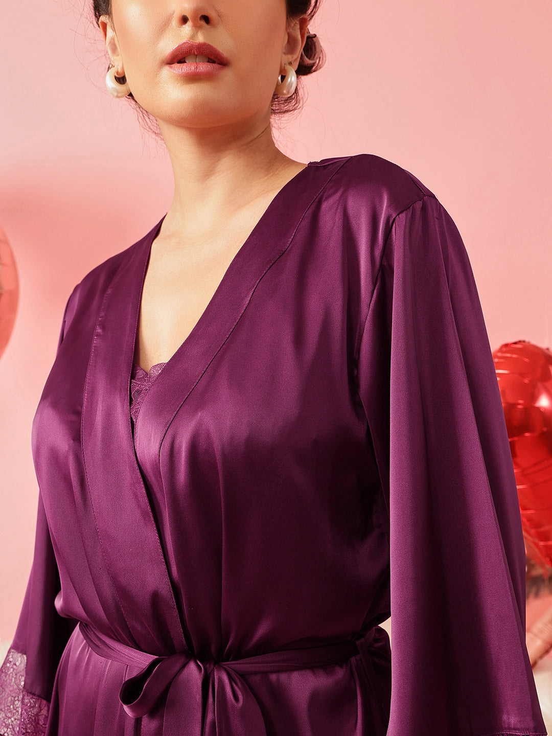 Add a touch of elegance to your nightwear wardrobe with this luxurious satin nighty and robe set. Designed with delicate lace accents and a flattering midi silhouette, the set blends comfort with sophistication. The flowy robe with tie-up belt layers beautifully over the strappy nighty, making it perfect for relaxed evenings or special nights in.