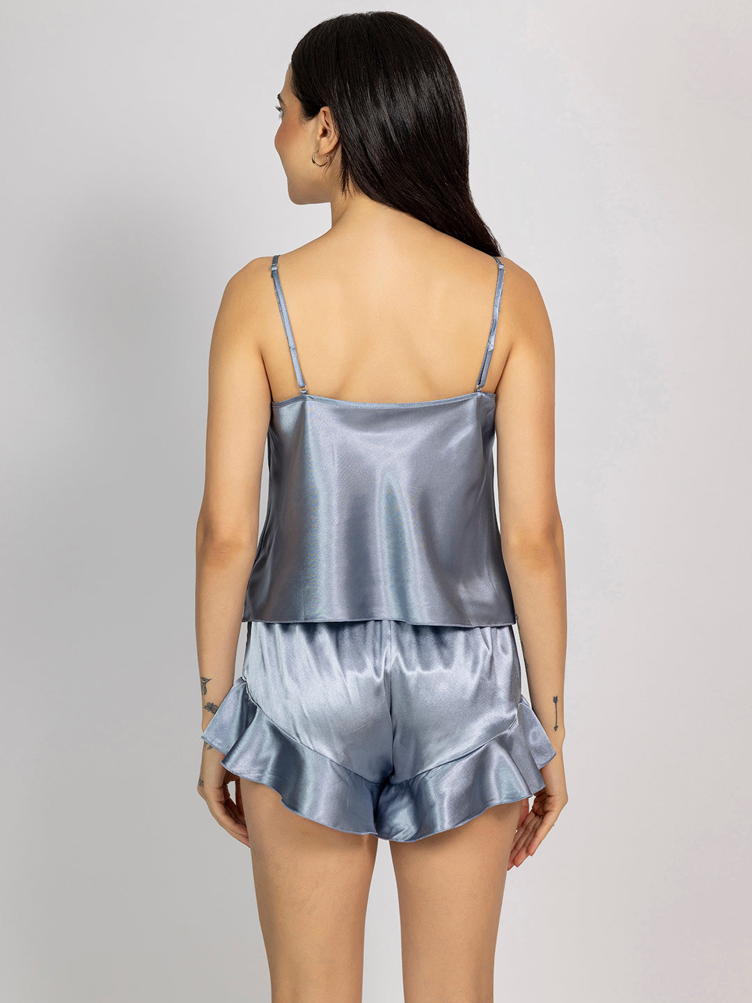 A chic satin camisole and shorts set in solid grey – soft, strappy, and perfect for cozy nights.