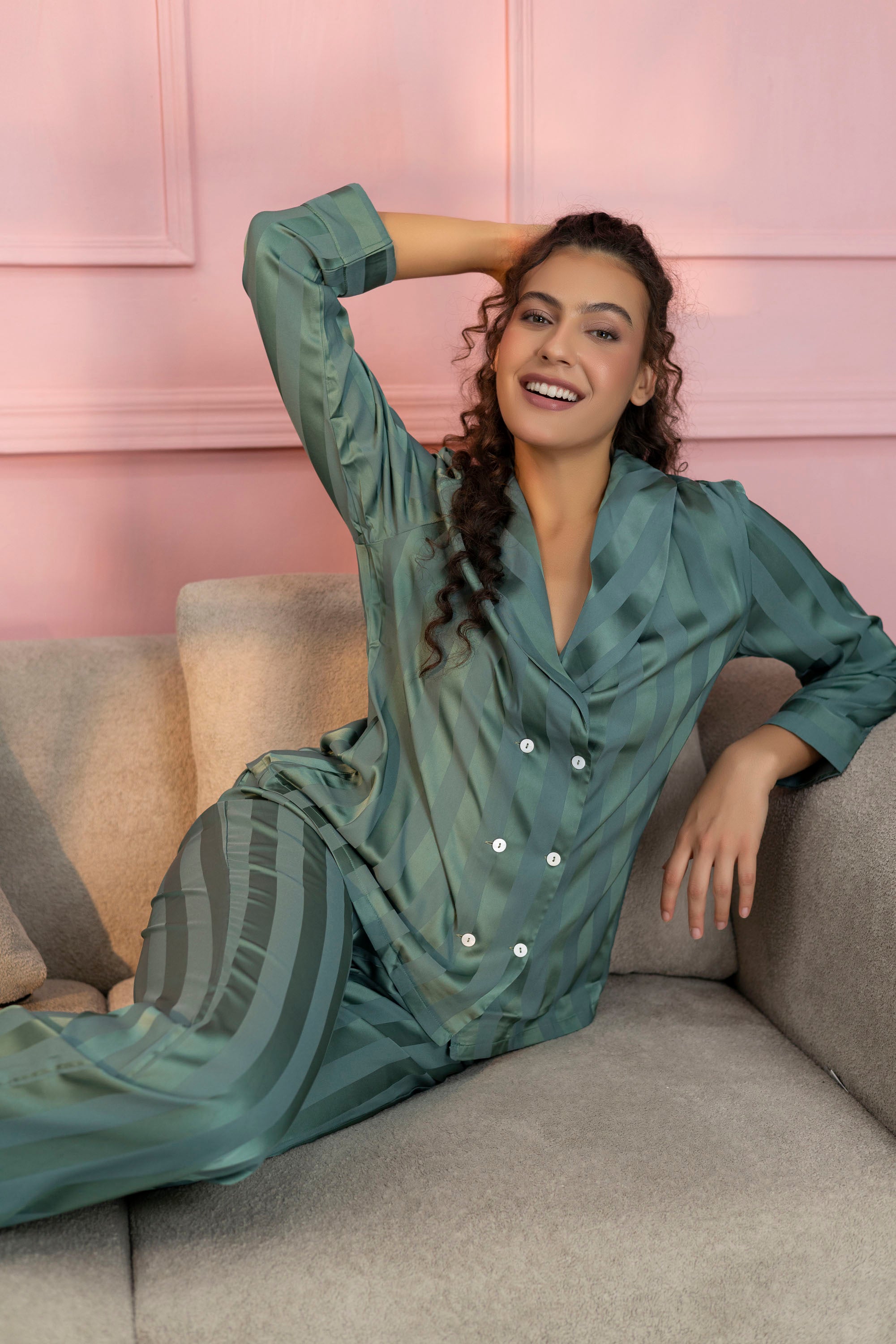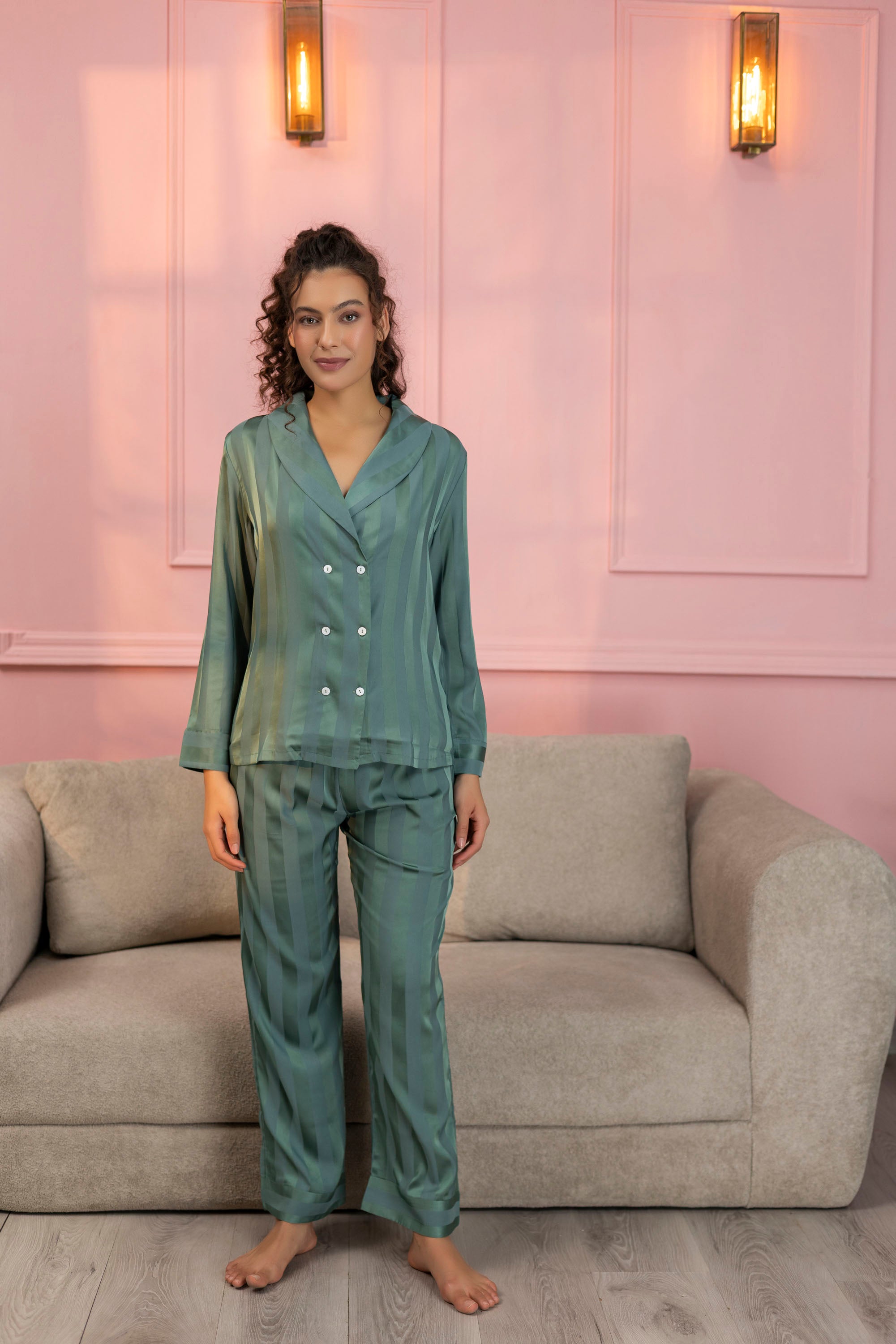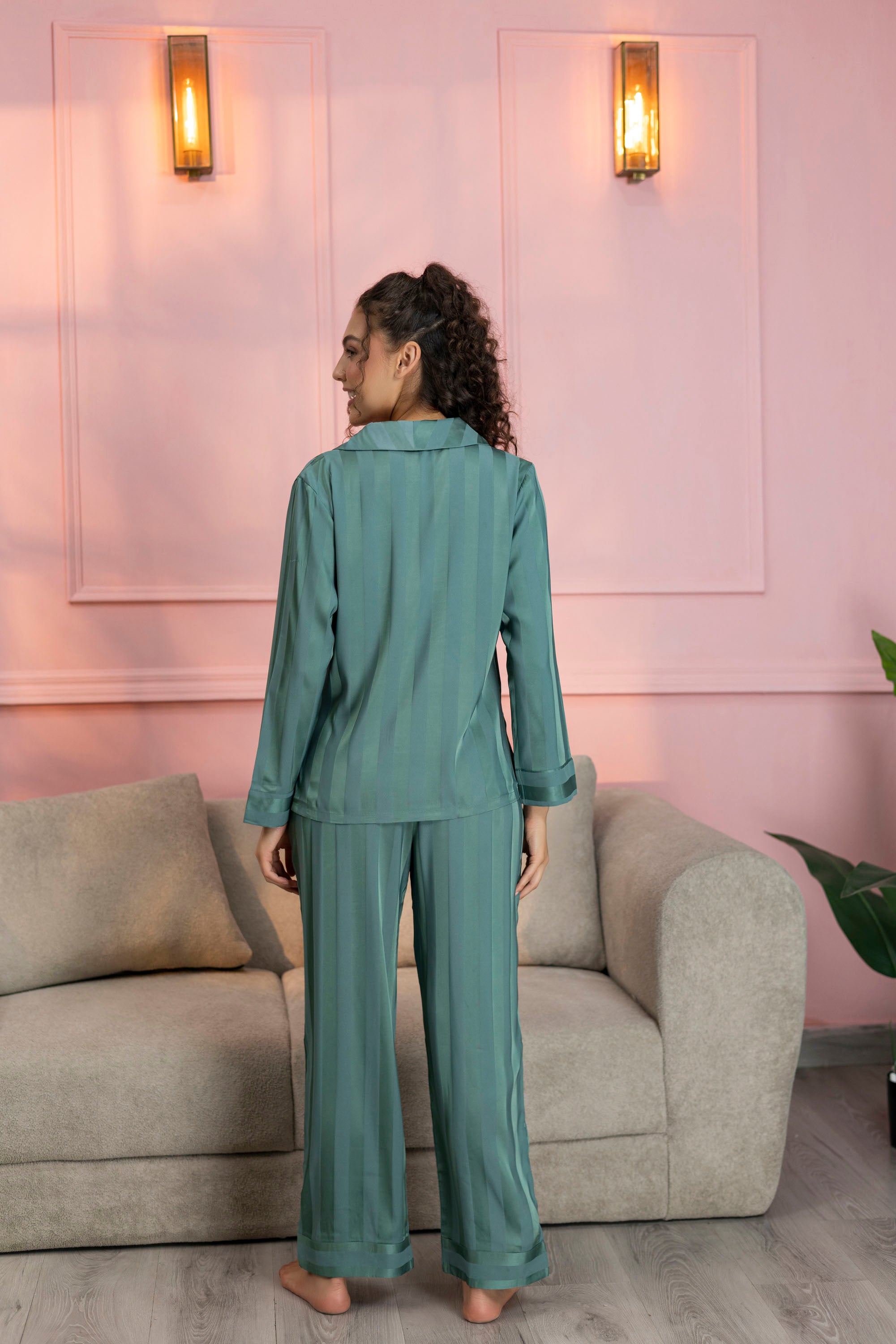 Striped Teal Green Satin Shirt & Pajama Set