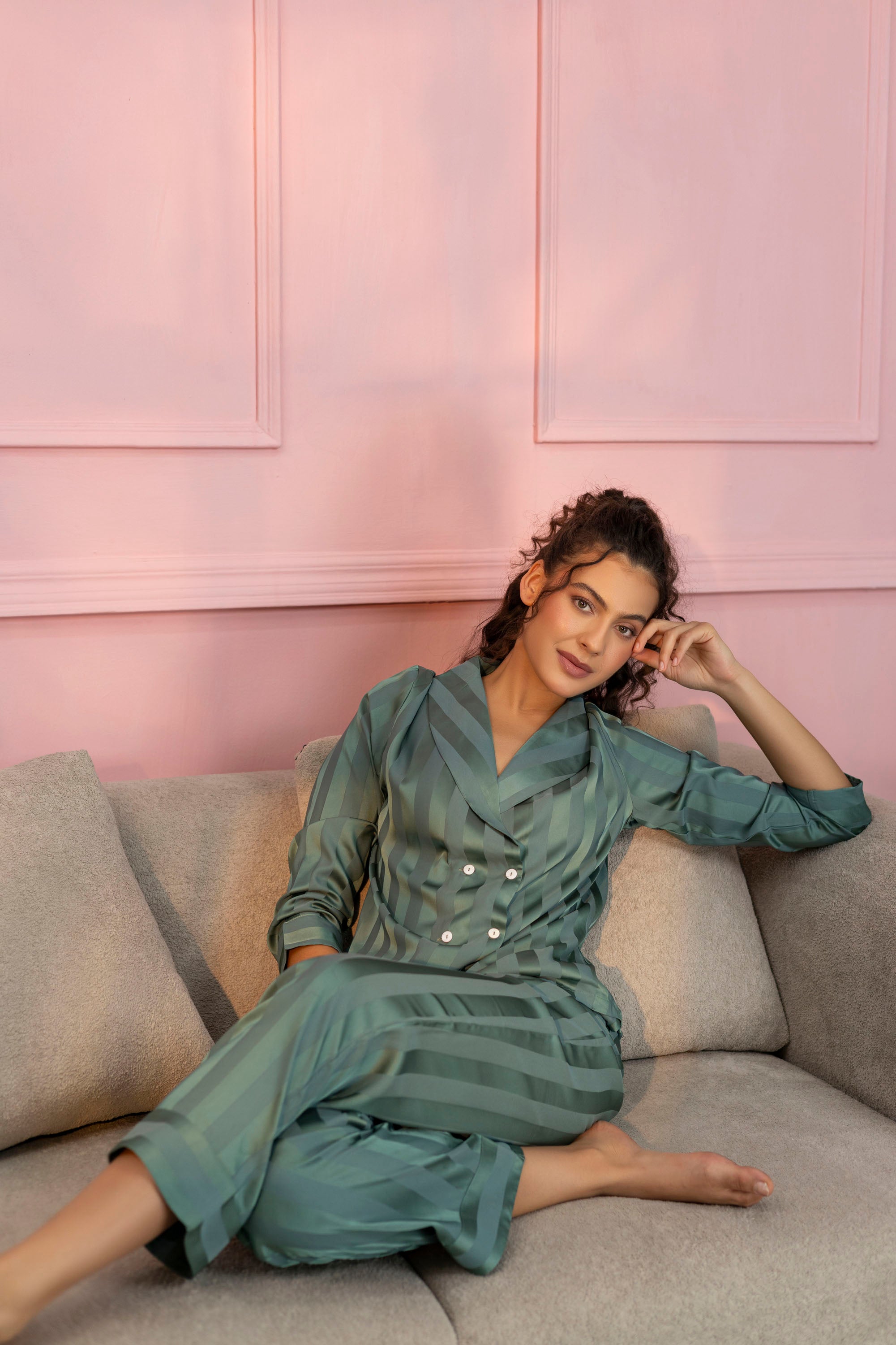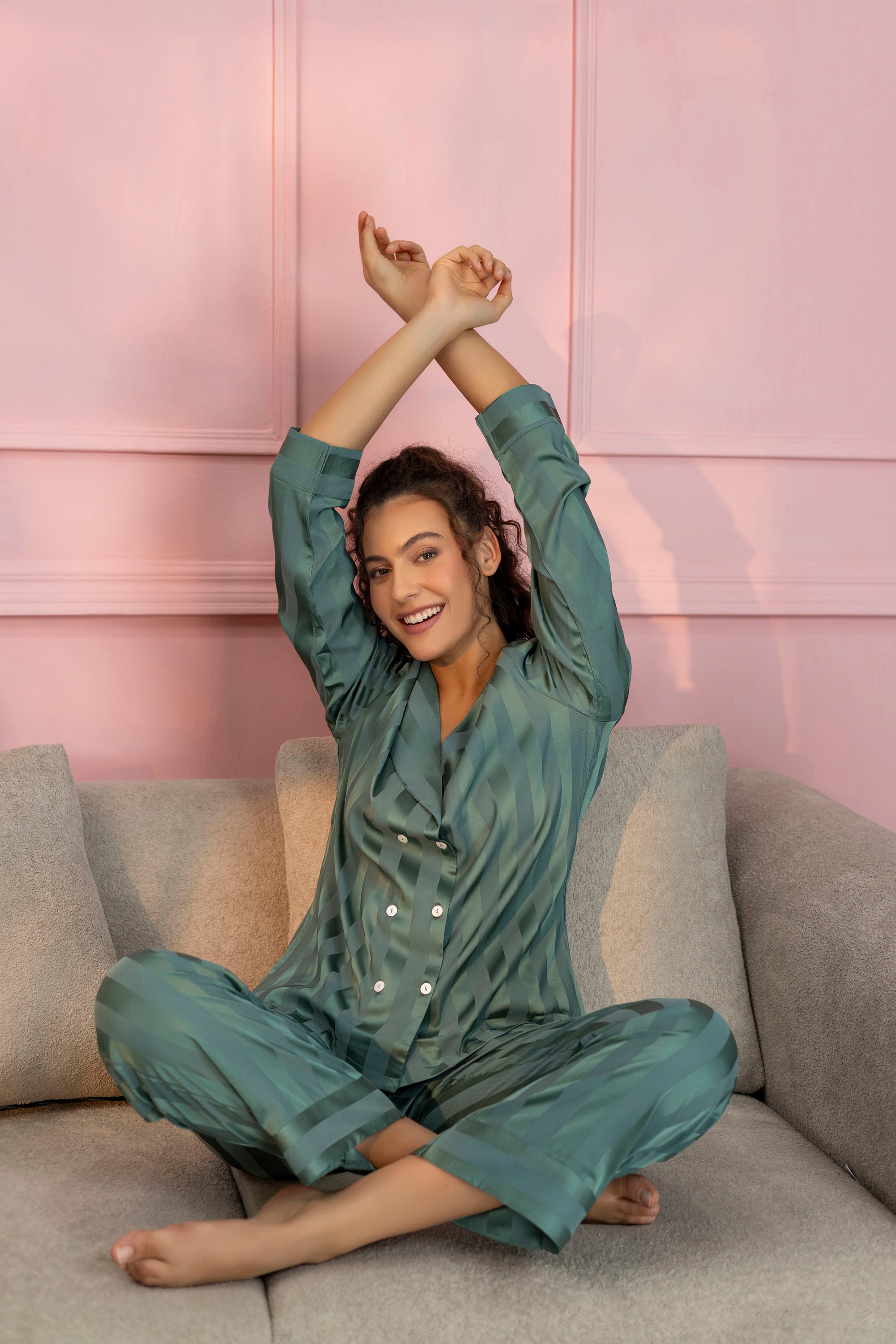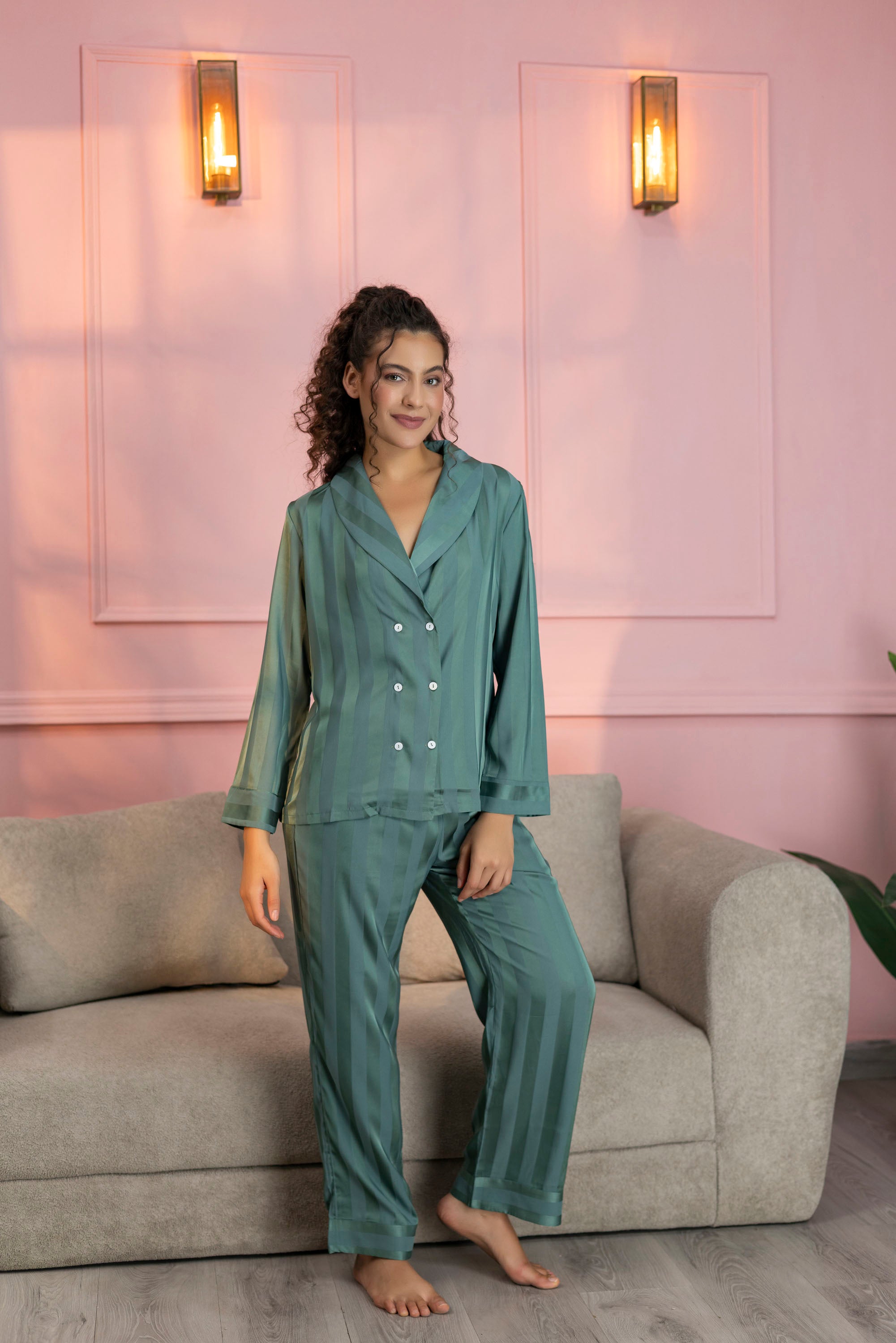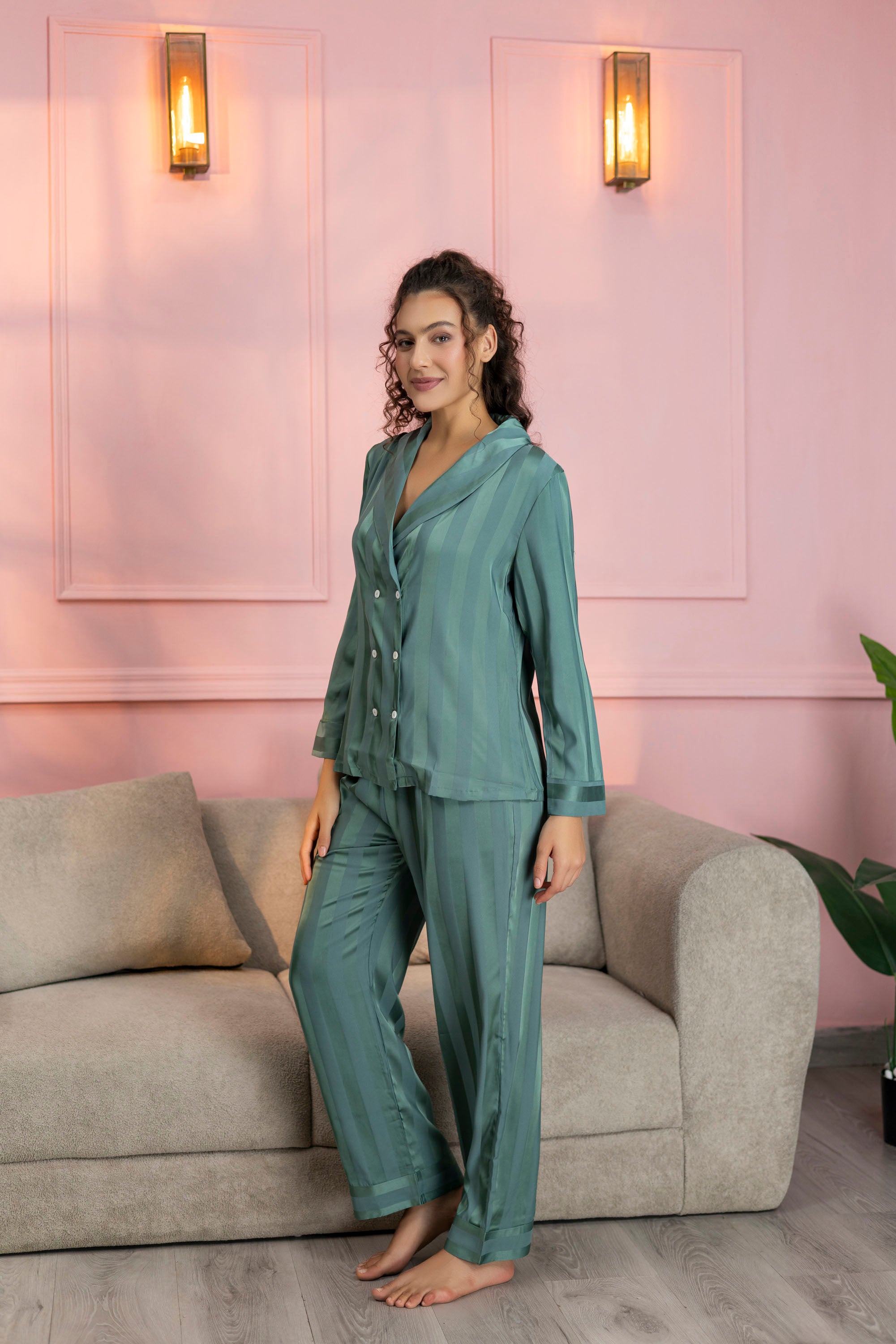 Striped Teal Green Satin Shirt & Pajama Set