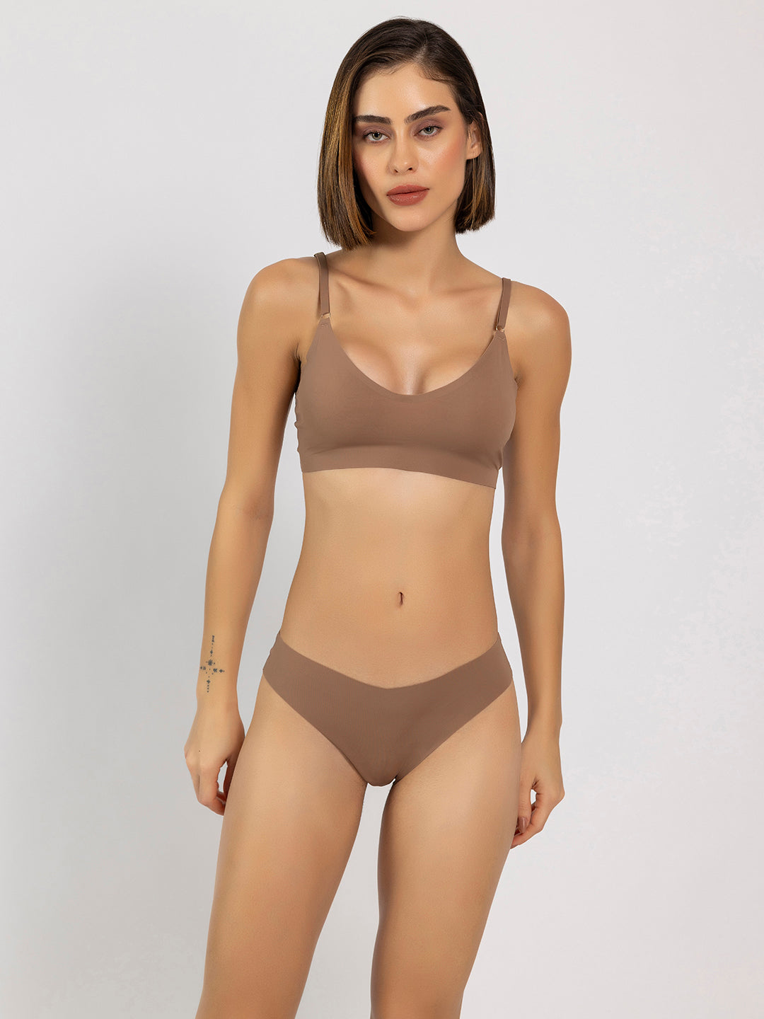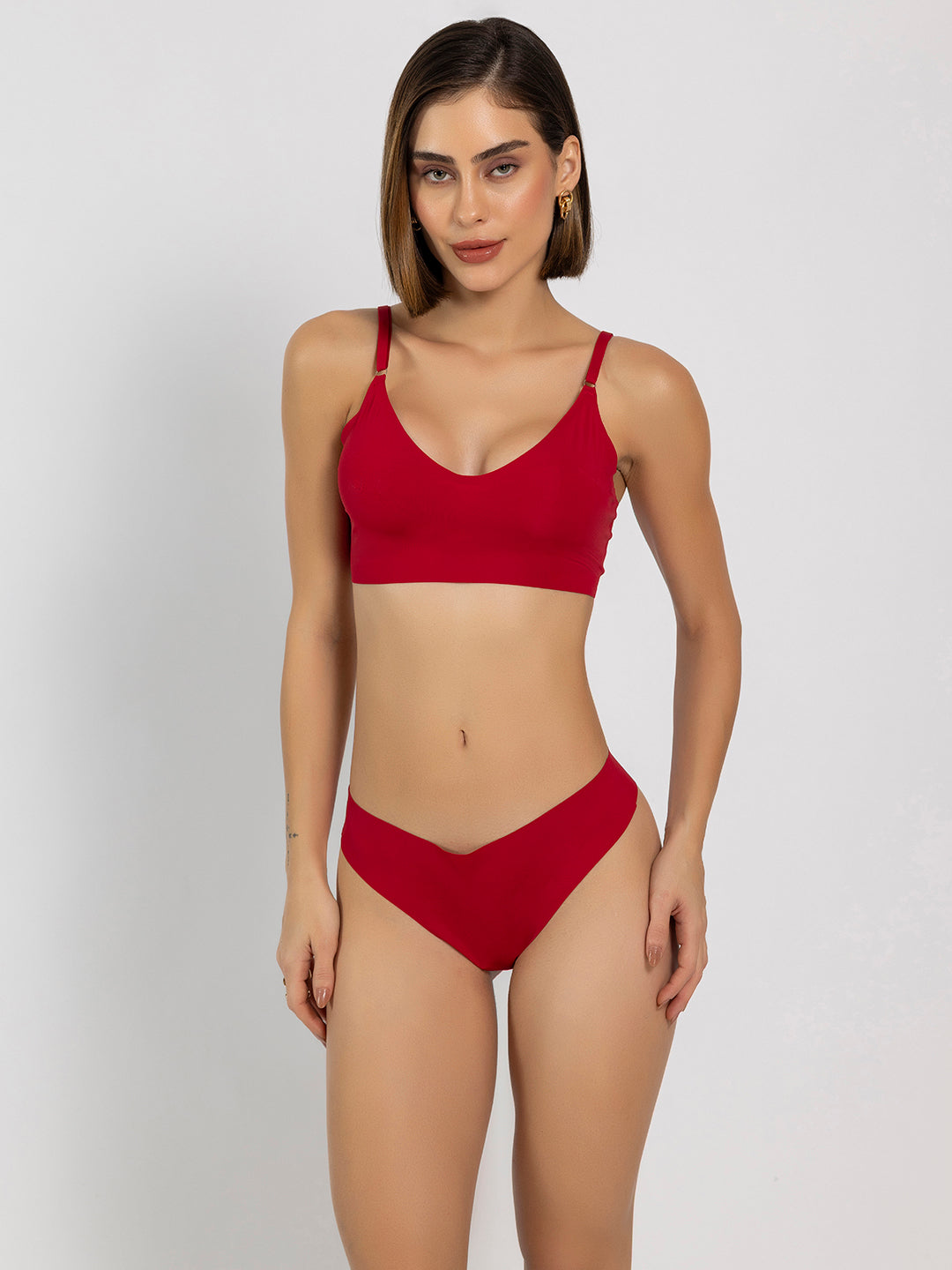 Experience all-day comfort with this seamless lingerie set. Features a low-rise bikini with minimal coverage and a full-coverage V neck bra. Perfect for everyday wear.