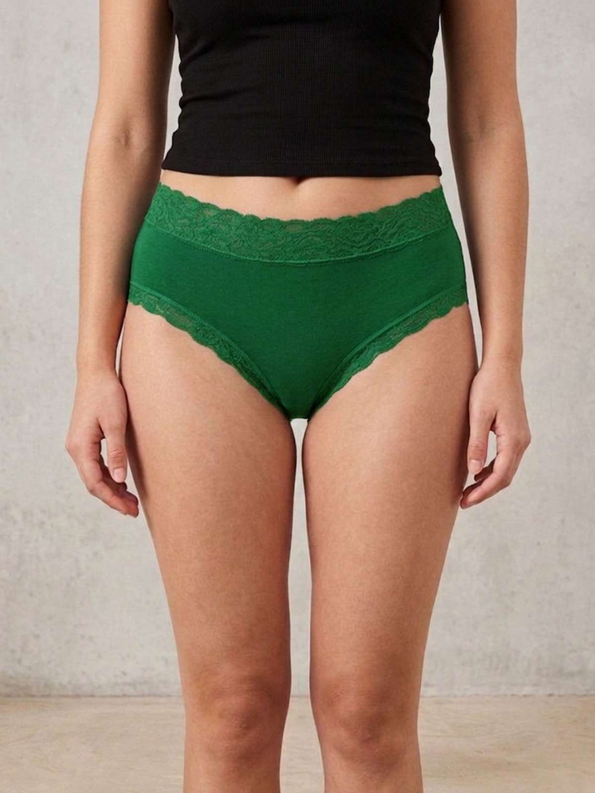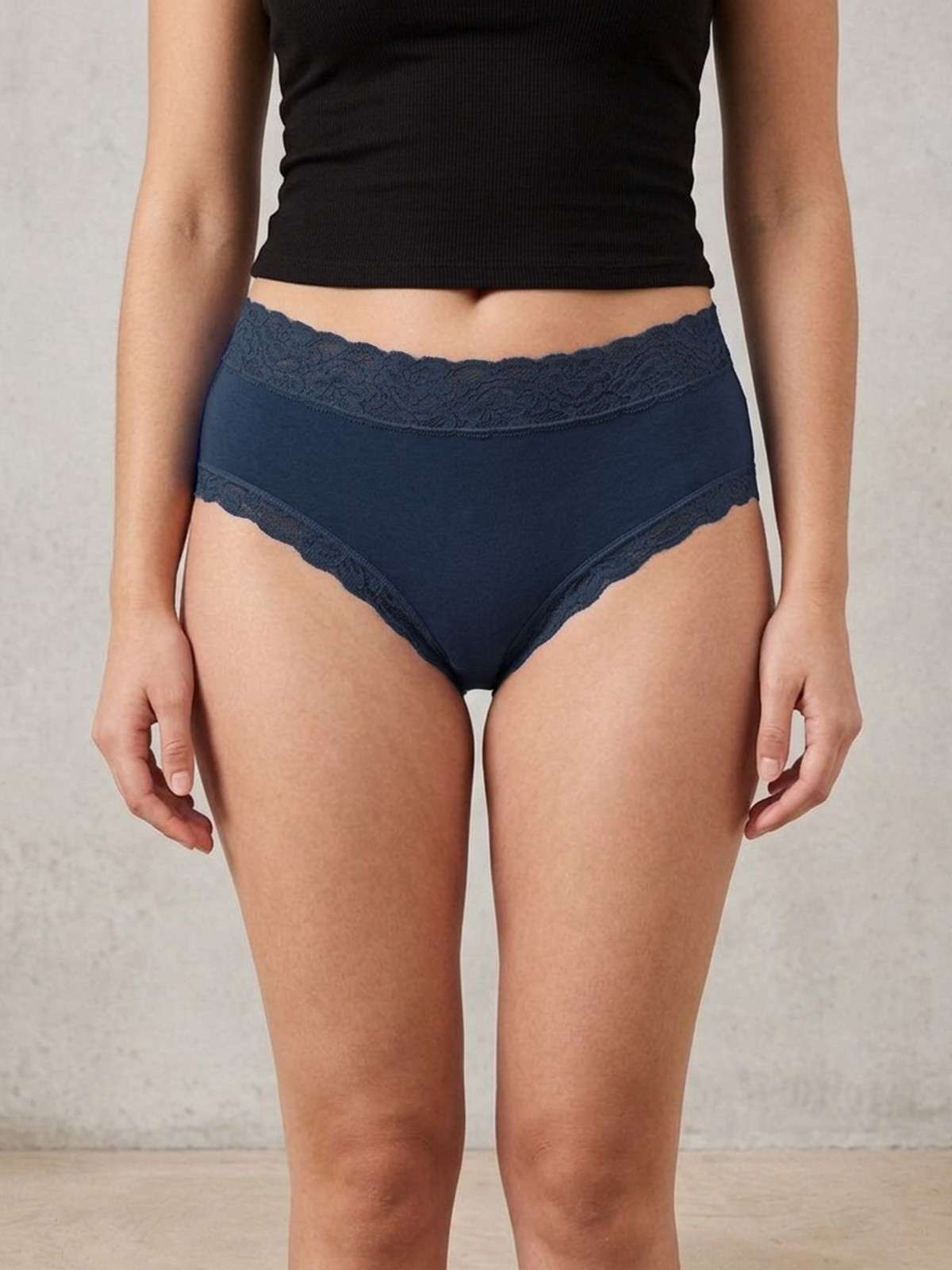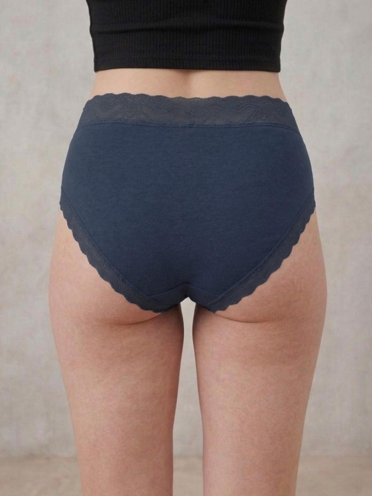 Key Features:- Fabric:- Cotton Spandex, Fit:- Mid-Hipster, Rise:- Mid-Rise, Stretch:- Stretchable, Waistband:- Soft Elasticated, Coverage:- Moderate, Design:- Solid with Lace Detail, Lace Detailing at back leg openings. |