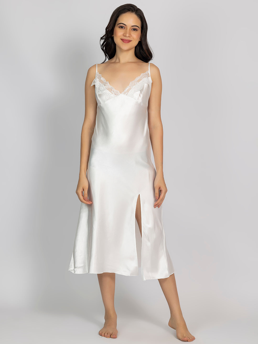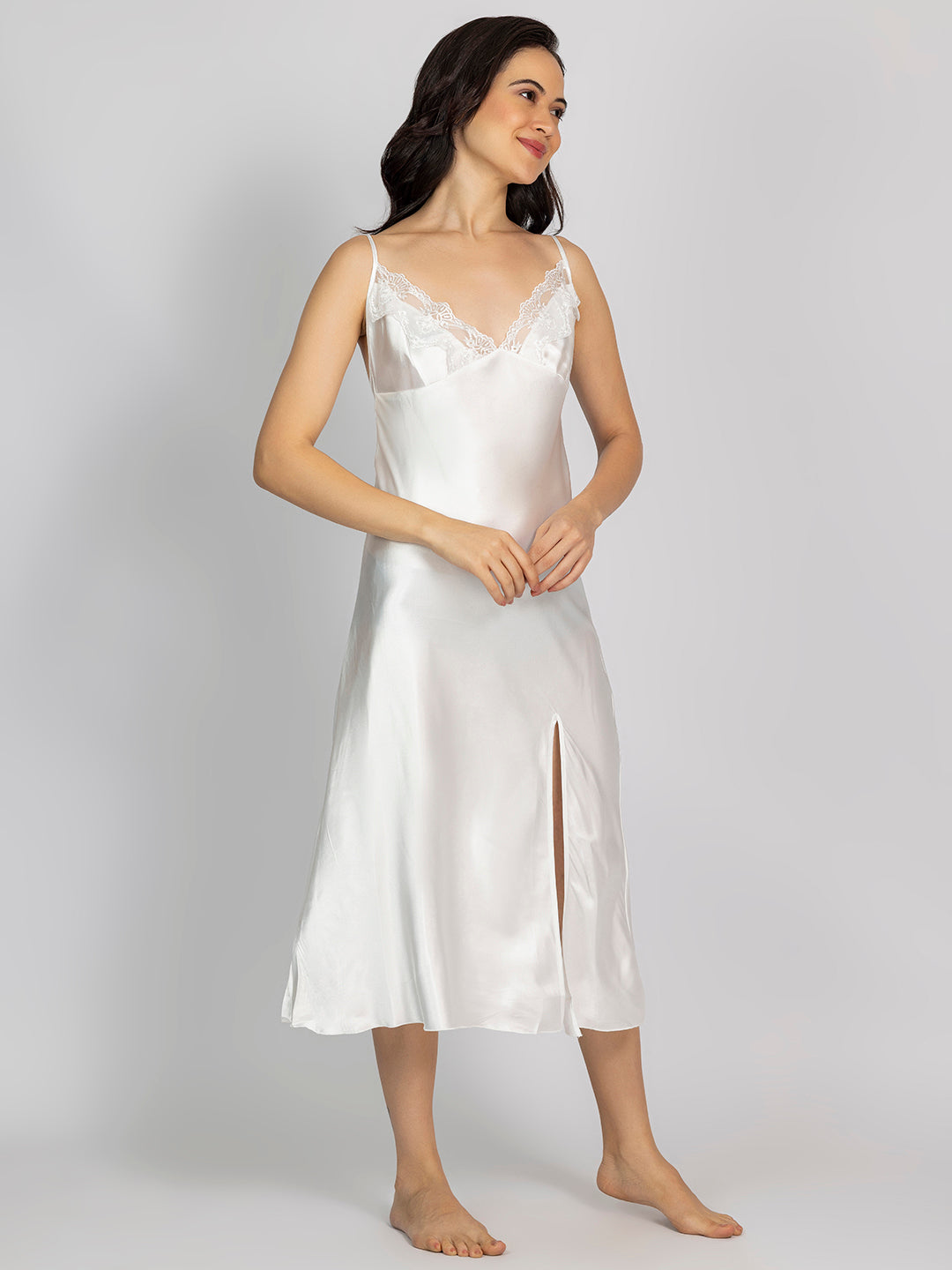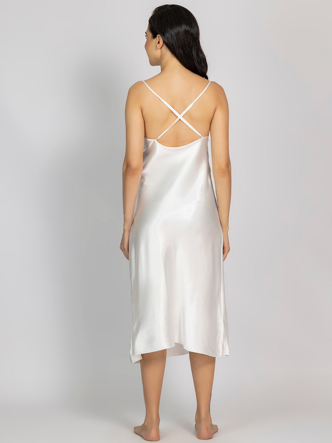 Turn bedtime into luxury with this off white embroidered satin slip dress with crossed back neck design, featuring delicate straps and a V-neck in a relaxed midi fit.