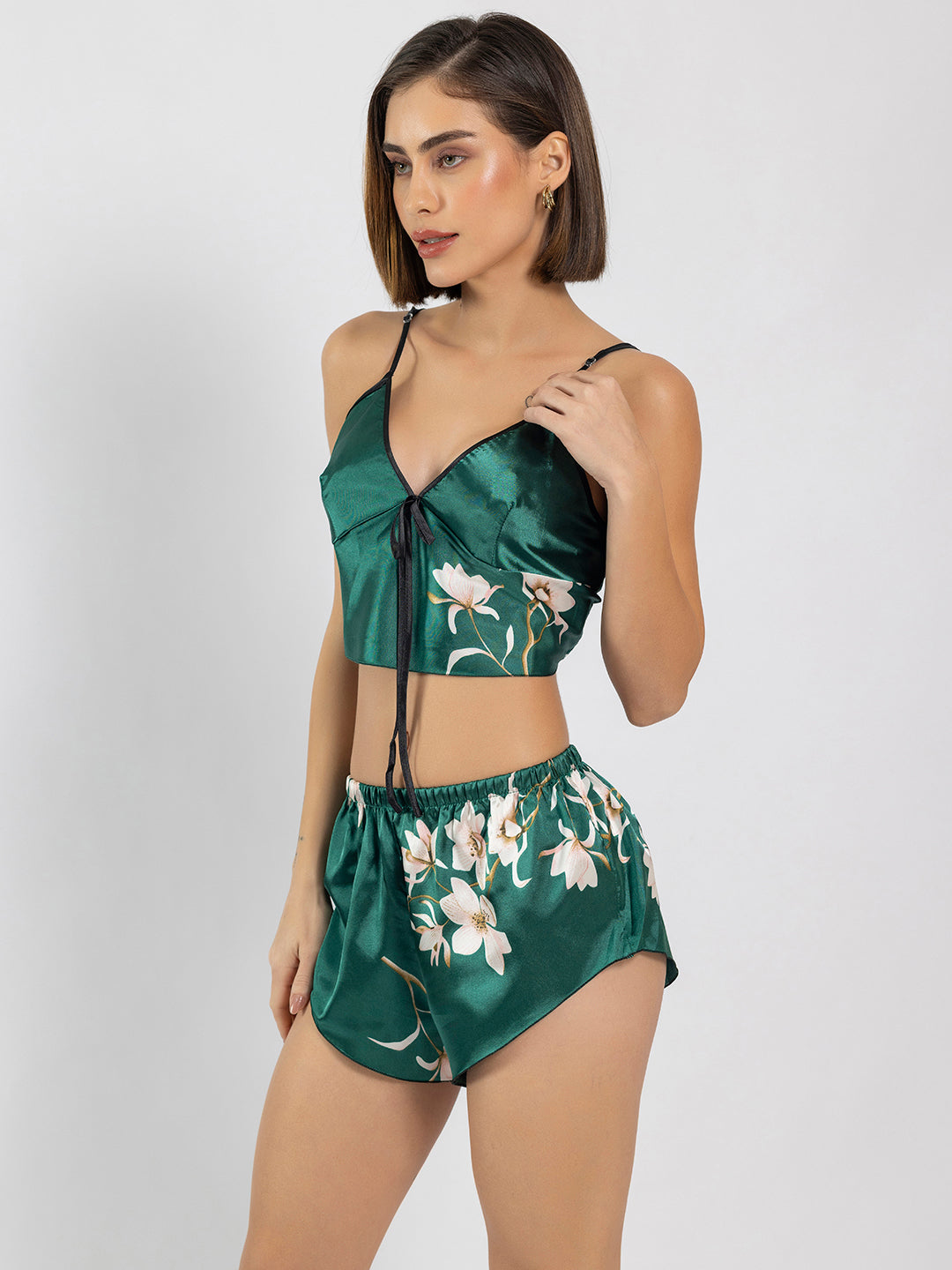 Bottle Green Floral Printed Satin Cami Top With Shorts