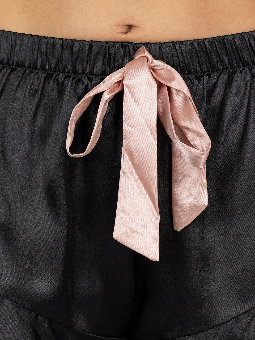 Soft satin in black with chic light pink contrasts – a strappy V-neck camisole paired with shorts featuring a stylish tie-up string.